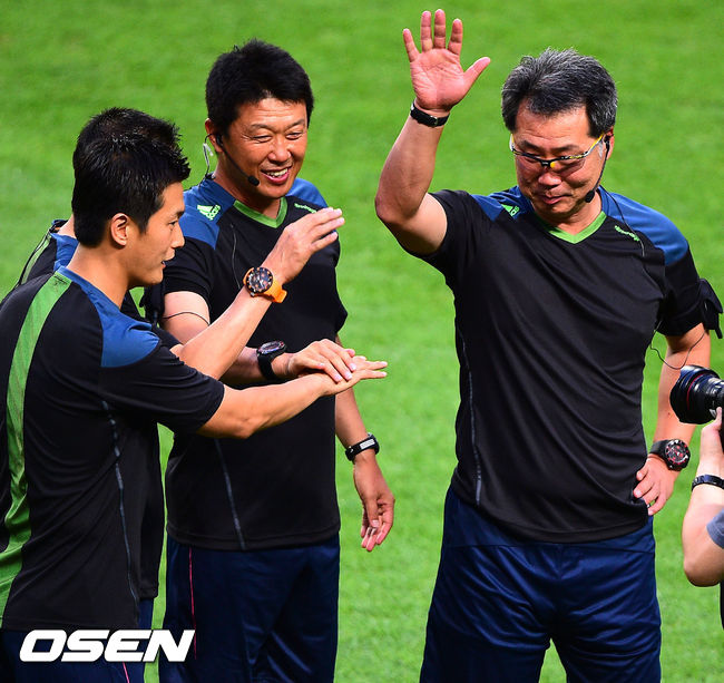 25일 오후 서울월드컵경기장에서 열린 '하나은행 K리그 올스타 with 팀 박지성' 올스타전에서 심판을 맡은 이상윤, 하석주, 조민국 감독이 포즈를 취하고 있다.
