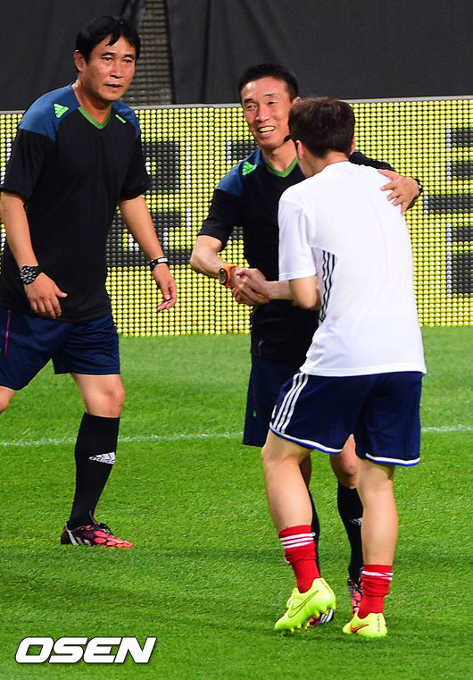 25일 오후 서울월드컵경기장에서 열린 '하나은행 K리그 올스타 with 팀 박지성' 올스타전에서 훈련중 박지성이 K리그 감독들에게 인사를 하고 있다.