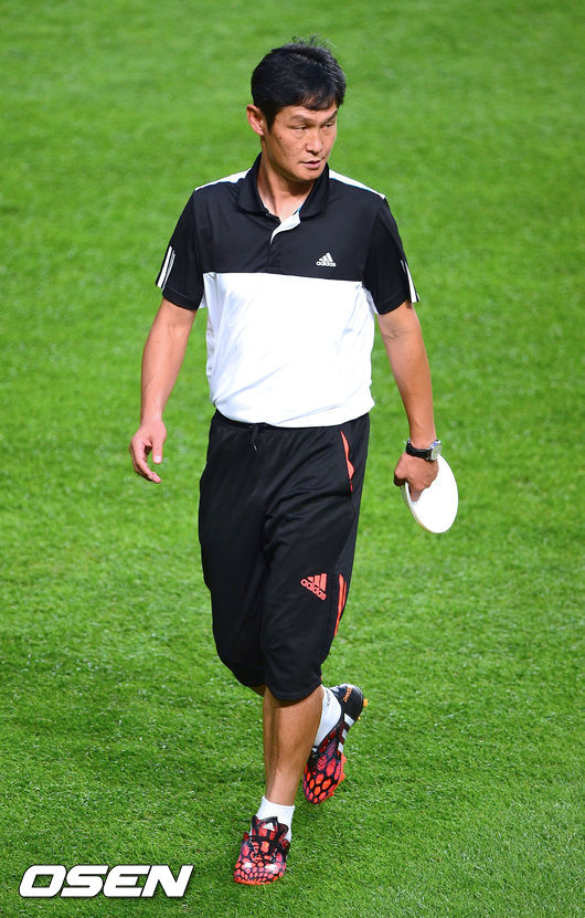 25일 오후 서울월드컵경기장에서 열린 '하나은행 K리그 올스타 with 팀 박지성' 올스타전에 앞서 최용수 감독이 선수들의 훈련을 돕고 있다.