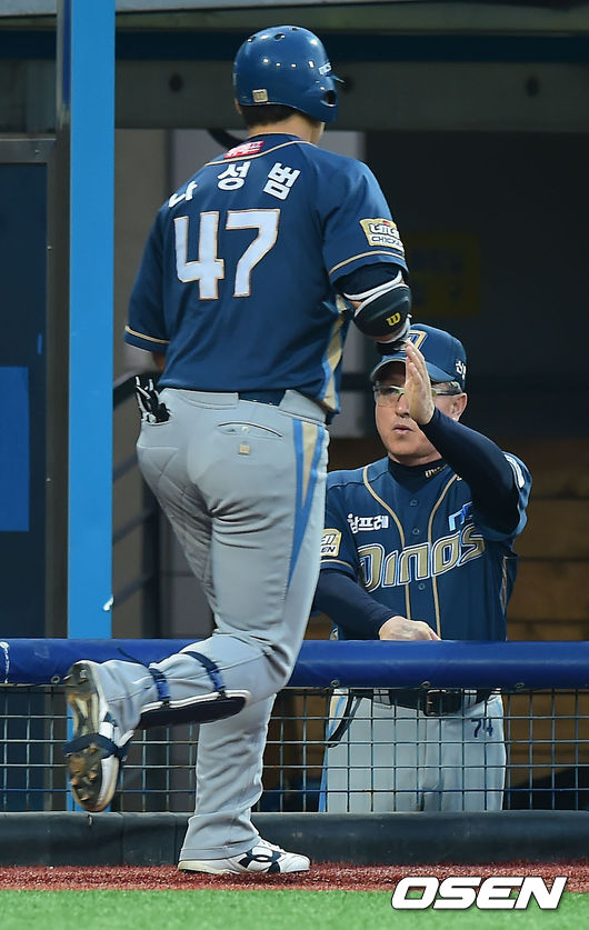 25일 오후 포항 야구장에서 열린 '2014 한국야쿠르트 세븐 프로야구' 삼성 라이온즈와 NC 다이노스의 경기, 3회초 2사 주자 1루 NC 나성범이 우월 동점 투런홈런을 날린 후 덕아웃에서 김경문 감독과 하이파이브를 하고 있다.