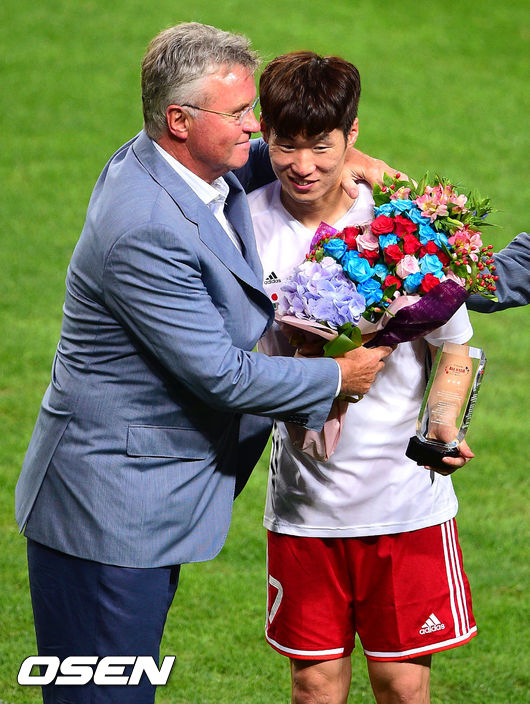 25일 오후 서울월드컵경기장에서 열린 '하나은행 K리그 올스타 with 팀 박지성' 올스타전에서 감사패를 받은 박지성이 히딩크 감독의 꽃다발 선물을 받고 있다.