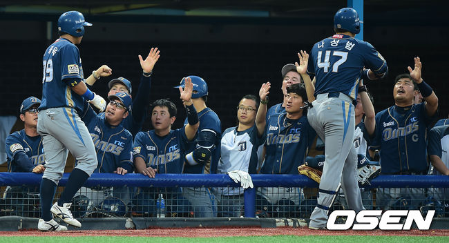 25일 오후 포항 야구장에서 열린 '2014 한국야쿠르트 세븐 프로야구' 삼성 라이온즈와 NC 다이노스의 경기, 3회초 2사 주자 1루 NC 나성범이 우월 동점 투런홈런을 날린 후 덕아웃에서 동료들과 하이파이브를 하고 있다.