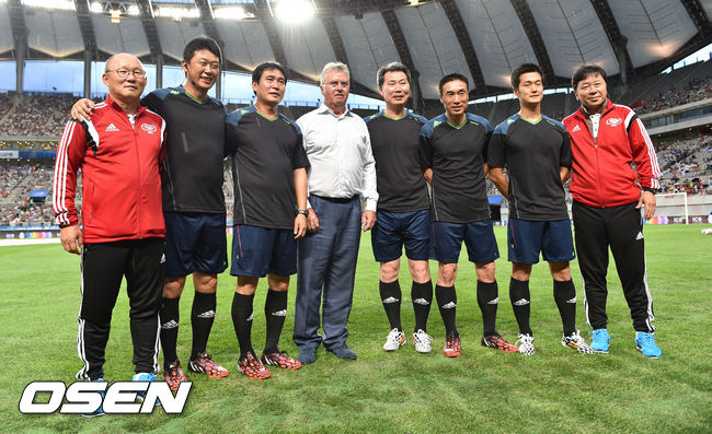 25일 오후 서울월드컵경기장에서 열린 '하나은행 K리그 올스타 with 팀 박지성' 올스타전에서 히딩크 감독이 K리그 감독들과 포즈를 취하고 있다