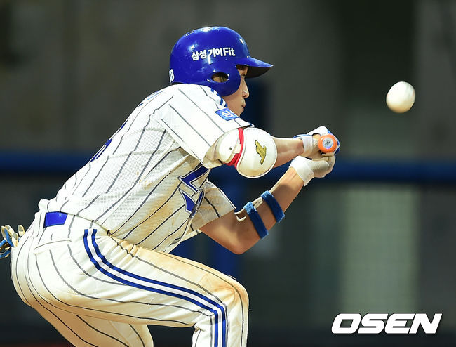 25일 오후 포항 야구장에서 열린 '2014 한국야쿠르트 세븐 프로야구' 삼성 라이온즈와 NC 다이노스의 경기, 3회말 무사 주자 2루 삼성 박해민이 희생번트에 성공하고 있다.