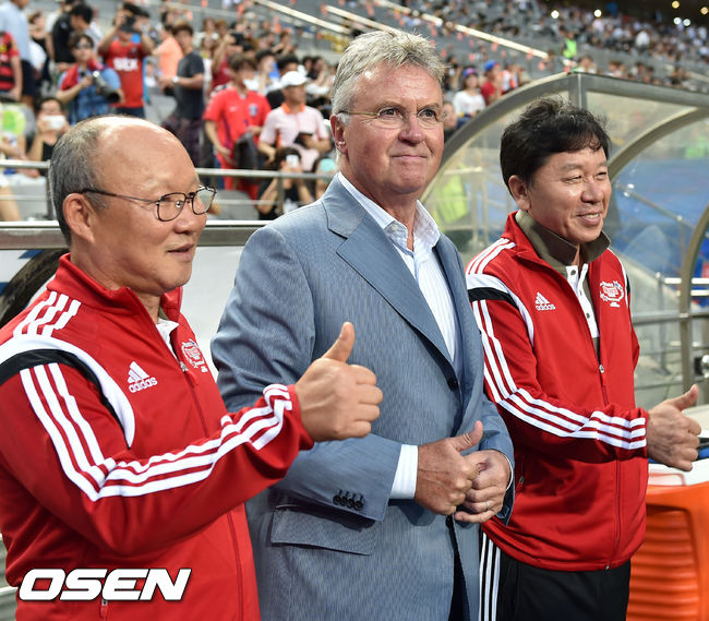 25일 오후 서울월드컵경기장에서 열린 '하나은행 K리그 올스타 with 팀 박지성' 올스타전에서 히딩크 감독이 박항서, 정해성 감독과 포즈를 취하고 있다