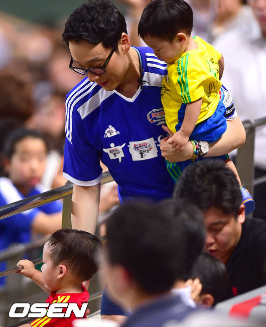 25일 오후 서울월드컵경기장에서 열린 '하나은행 K리그 올스타 with 팀 박지성' 올스타전에서 이휘재가 쌍둥이를 데리고 관전하고 있다.