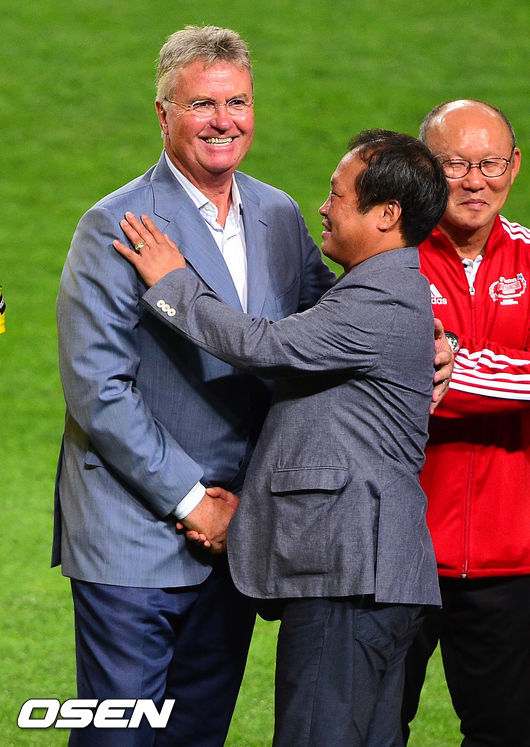 25일 오후 서울월드컵경기장에서 열린 '하나은행 K리그 올스타 with 팀 박지성' 올스타전에서 히딩크 감독과 박지성 아버지 박성종씨가 인사를 나누고 있다