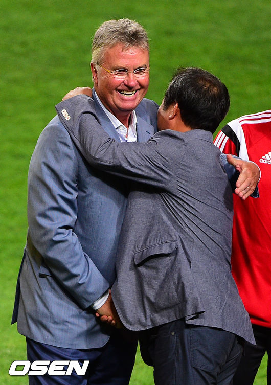 25일 오후 서울월드컵경기장에서 열린 '하나은행 K리그 올스타 with 팀 박지성' 올스타전에서 히딩크 감독과 박지성 아버지 박성종씨가 인사를 나누고 있다