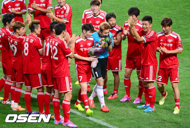 25일 오후 서울월드컵경기장에서 열린 '하나은행 K리그 올스타 with 팀 박지성' 올스타전에서 팀 박지성 강수일의 선취골때 박지성이 결혼 세레모니를 하고 있다.