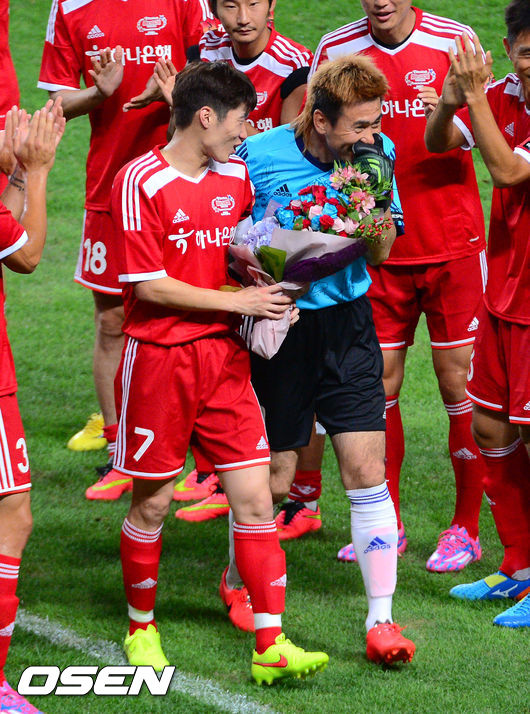 25일 오후 서울월드컵경기장에서 열린 '하나은행 K리그 올스타 with 팀 박지성' 올스타전에서 팀 박지성 강수일의 선취골때 박지성이 결혼 세레모니를 하고 있다.