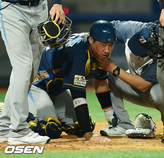 25일 오후 포항 야구장에서 열린 '2014 한국야쿠르트 세븐 프로야구' 삼성 라이온즈와 NC 다이노스의 경기, 5회말 2사 주자 2,3루 삼성 채태인 타석에서 웨버의 볼에 맞은 NC 김태군이 고통스러워하고 있다.