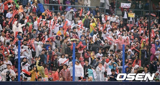 그런데 그 때였다. 최준석이 적시타를 친 것과 동시에 잠실구장에 장대비가 쏟아졌다. 갑작스러운 비에 관중들 모두 우산을 들었는데, 1루측에 응집한 LG 팬들은 우천취소를 바라는 환호를 보냈다.
