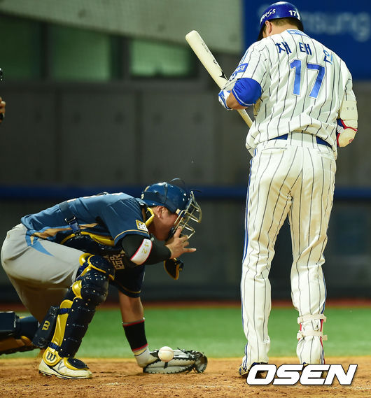 25일 오후 포항 야구장에서 열린 '2014 한국야쿠르트 세븐 프로야구' 삼성 라이온즈와 NC 다이노스의 경기, 5회말 2사 주자 2,3루 삼성 채태인 타석에서 웨버의 볼에 맞은 NC 김태군이 고통스러워하고 있다.