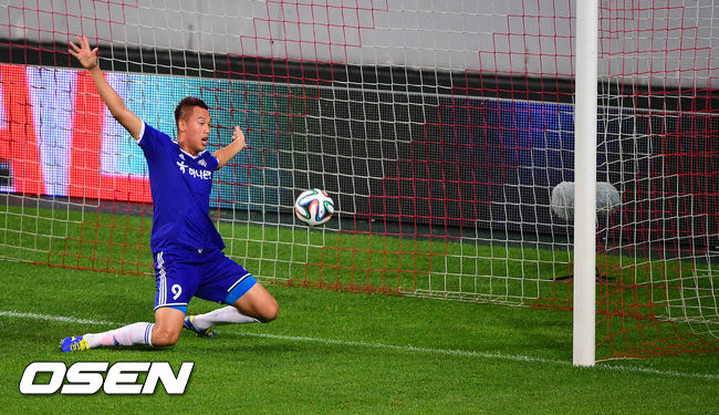25일 오후 서울월드컵경기장에서 열린 '하나은행 K리그 올스타 with 팀 박지성' 올스타전에서 전반 김승규의 페널티킥 골때 김신욱이 브라질월드컵 러시아전 골을 재현하고 있다