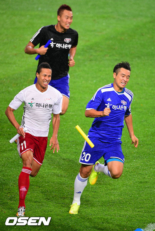 25일 오후 서울월드컵경기장에서 열린 '하나은행 K리그 올스타 with 팀 박지성' 올스타전에서 하프타임 릴레이에서 이동국이 강수일의 손에 의해 바톤을 놓치고 있다.