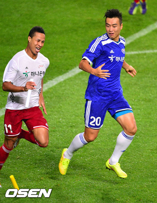 25일 오후 서울월드컵경기장에서 열린 '하나은행 K리그 올스타 with 팀 박지성' 올스타전에서 하프타임 릴레이에서 이동국이 강수일과 부딪쳐 바톤을 놓치고 있다.
