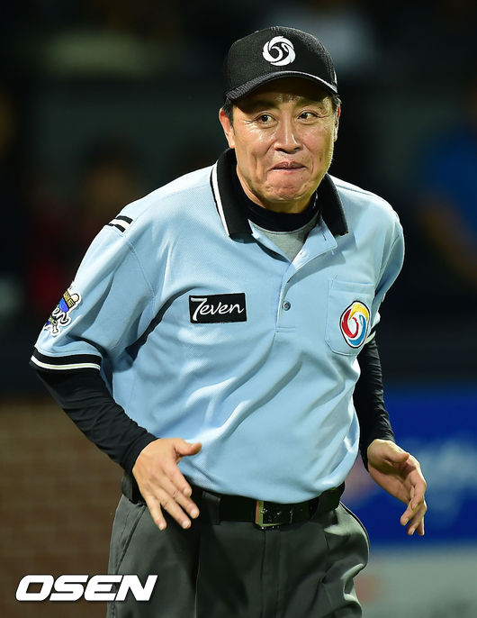 박기택 1루심이 1회에 이어 6회에도 합의판정에 의해 판정이 번복되자 쑥스러워하고 있다.