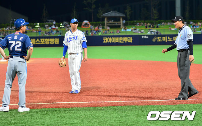 25일 오후 포항 야구장에서 열린 '2014 한국야쿠르트 세븐 프로야구' 삼성 라이온즈와 NC 다이노스의 경기, 삼성이 6-3으로 앞선 6회 2사 1루. 김종호가 삼성 좌완투수 차우찬을 상대로 2루수 앞 땅볼을 때렸다. 삼성 2루수 나바로가 앞으로 달려나오며 포구한 뒤 1루에 뿌렸다. 1루심은 최초 아웃 판정했다.