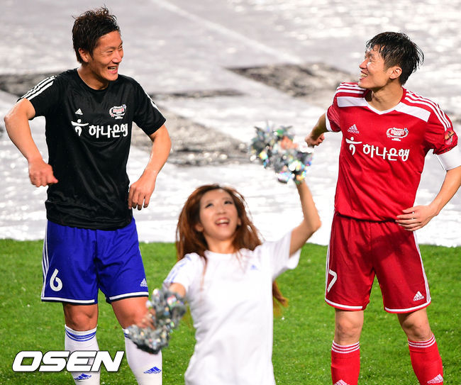 25일 오후 서울월드컵경기장에서 열린 '하나은행 K리그 올스타 with 팀 박지성' 올스타전에서 박지성이 하프타임 릴레이에서 바톤을 놓친 이동국을 따라하고 있다