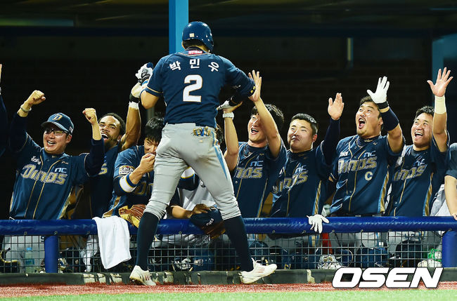 25일 오후 포항 야구장에서 열린 '2014 한국야쿠르트 세븐 프로야구' 삼성 라이온즈와 NC 다이노스의 경기,6회초 2사 주자 1,2루 NC 박민우가 좌월 동점 스리런 홈런을 날린 후 덕아웃에서 동료들과 하이파이브를 하고 있다.