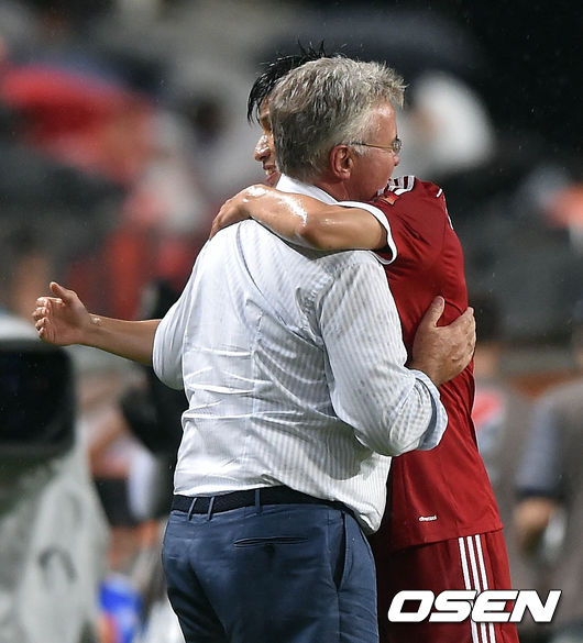25일 오후 서울월드컵경기장에서 열린 '하나은행 K리그 올스타 with 팀 박지성' 올스타전에서 정조국이 골을 넣고 히딩크 감독과 포옹을 하고 있다