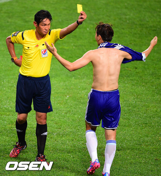 25일 오후 서울월드컵경기장에서 열린 '하나은행 K리그 올스타 with 팀 박지성' 올스타전에서 후반 최용수 주심이 상의탈의 세레모니를 펼친 임상협에게 카드를 보이고 있다