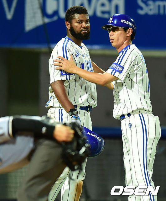 25일 오후 포항 야구장에서 열린 '2014 한국야쿠르트 세븐 프로야구' 삼성 라이온즈와 NC 다이노스의 경기, 7회말 선두타자 삼성 나바로가 타석에서 NC 원종현의 위협구에 흥분하자 김재걸 코치가 진정시키고 있다.