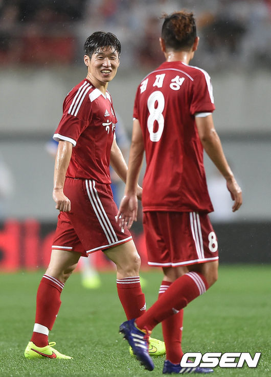 25일 오후 서울월드컵경기장에서 열린 '하나은행 K리그 올스타 with 팀 박지성' 올스타전에서 박지성이 정대세의 골을 어시스트하고 김재성과 이야기를 나누고 있다