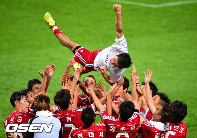 25일 오후 서울월드컵경기장에서 열린 '하나은행 K리그 올스타 with 팀 박지성' 올스타전에서 후반 이영표가 헹가래를 받고 있다