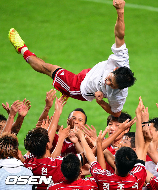 25일 오후 서울월드컵경기장에서 열린 '하나은행 K리그 올스타 with 팀 박지성' 올스타전에서 후반 이영표가 헹가래를 받고 있다