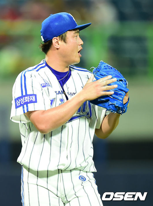 25일 오후 포항 야구장에서 열린 '2014 한국야쿠르트 세븐 프로야구' 삼성 라이온즈와 NC 다이노스의 경기, 8회초 NC의 공격을 막아낸 삼성 안지만이 박수를 보내고 있다.