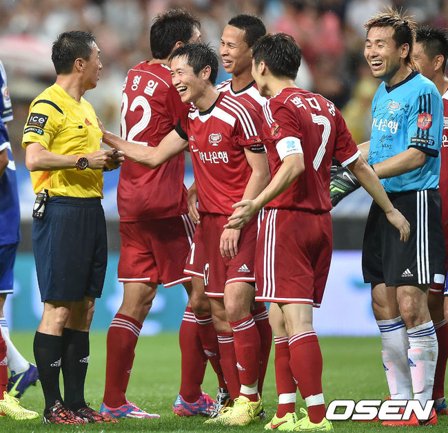 전반 주심으로 나선 하석주 감독이 엉뚱하게도 박지성에게 옐로우 카드를 꺼내고 있다./sun@osen.co.kr