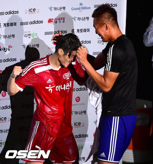 경기종료 후 물세례를 받은 박지성이 김신욱에게 화풀이를 하고 있다. /sou1014@osen.co.kr