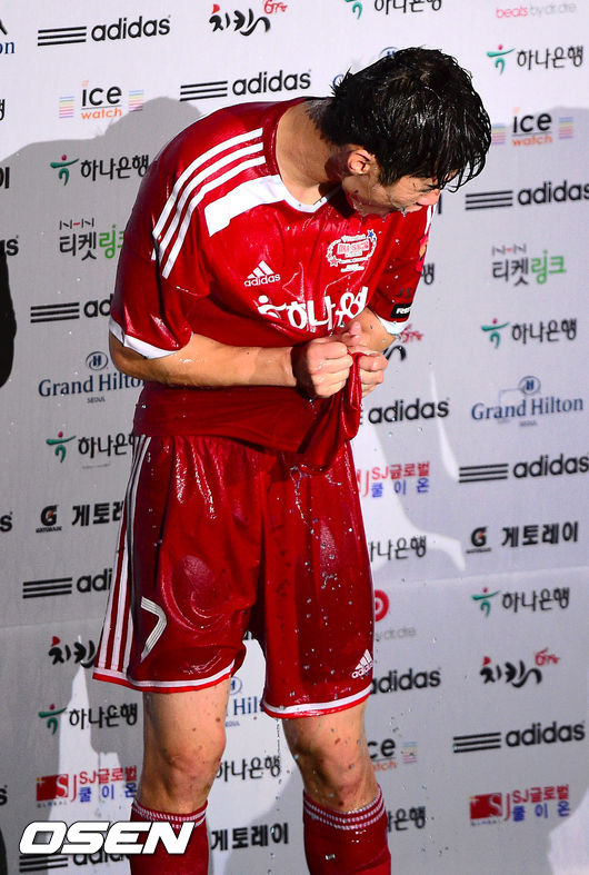 경기종료 후 박지성이 김신욱의 물세례에 흠뻑 젖어 있다. /sou1014@osen.co.kr