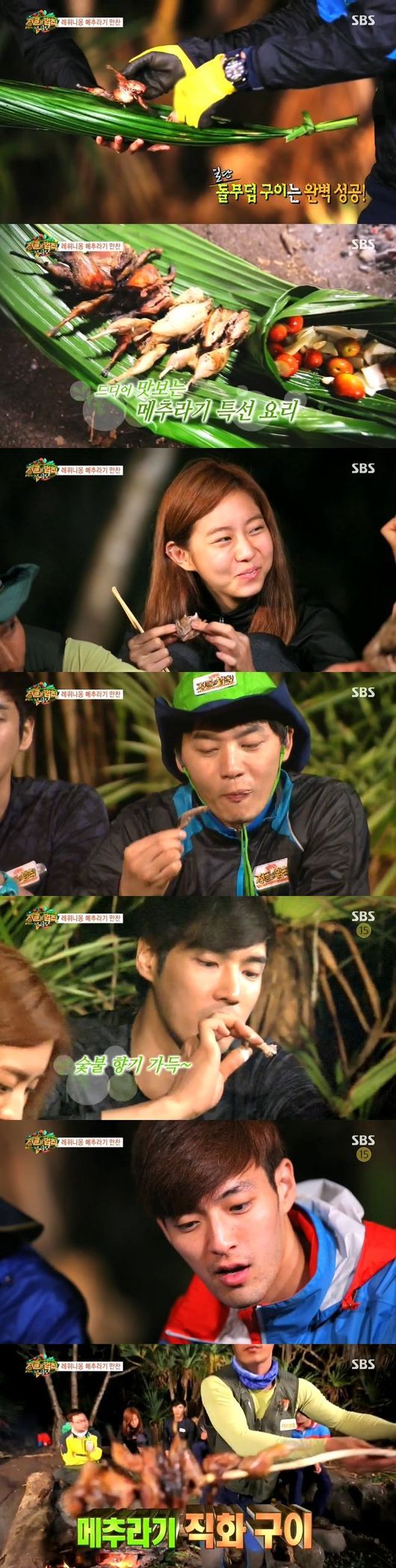 25일 오후 방송된 SBS 예능프로그램 '정글의 법칙 in 인도양'에서는 김병만-김승수가 직접 잡은 메추라기 고기를 구워 먹는 병만족의 모습이 그려졌다.