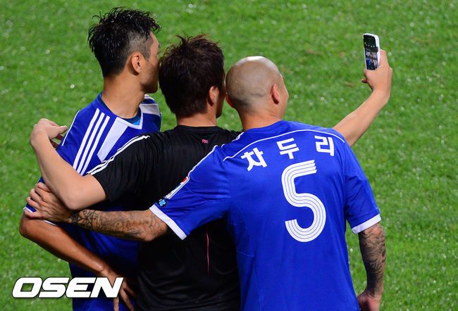 후반 임상협이 이동국이 골을 넣고 김진규 차두리와 셀카 세리머니를 하고 있. /sou1014@osen.co.kr