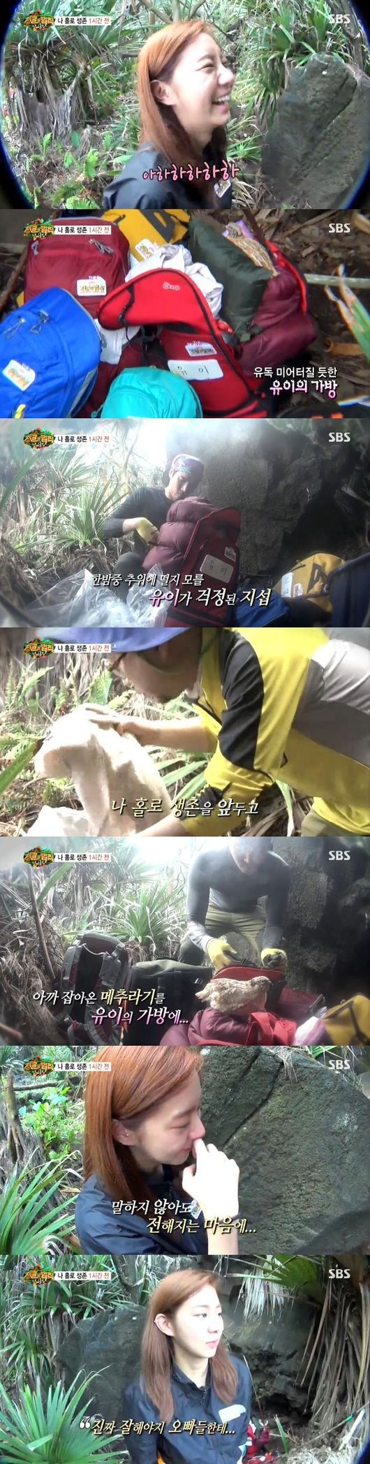 유이는 25일 오후 방송된 SBS 예능프로그램 '정글의 법칙 in 인도양'에서 나홀로 생존을 앞두고 모두의 짐이 놓인 장소로 돌아왔다. 짐을 보던 그는 웃음을 터뜨렸다. 자신의 가방에 물건이 가득 들어있었던 것.