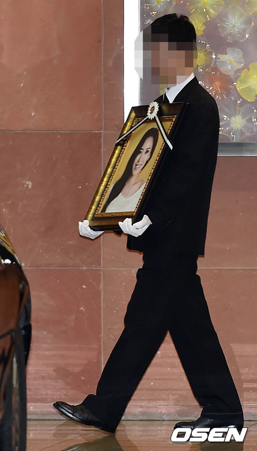 故 유채영의 가족이 영정 사진을 들고 운구차로 이동하고 있다.