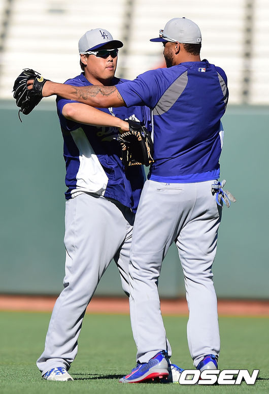 26일(이하 한국시간) 미국 캘리포니아주 샌프란시스코 AT&T 파크에서 열리는 '2014 메이저리그' 샌프란시스코 자이언츠와 LA 다저스의 경기에 앞서 다저스 켐프가 훈련을 하던 류현진에게 장난을 치고 있다.