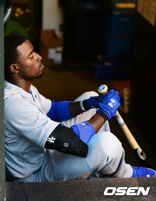 경기 시작전 다저스 디 고든이 더그아웃 계단에 앉은 채 생각에 잠겨 있다.