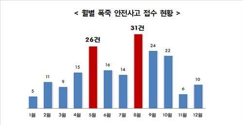 한국소비자원은 2011년부터 지난달까지 접수한 폭죽 안전사고는 189건이었다고 24일 밝혔다. 특히 본격 휴가철인 8월의 발생 빈도(16.4%)가 가장 높았다.