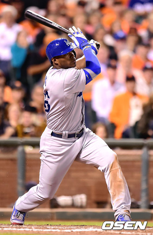 5회초 1사 3루 다저스 푸이그가 1타점 적시 3루타를 때리고 있다.