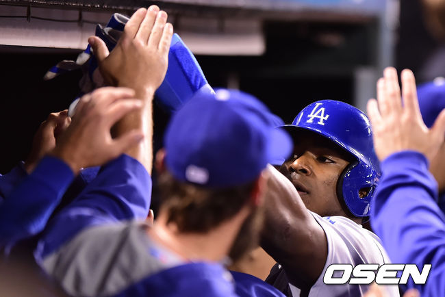 5회초 1사 3루 다저스 푸이그가 곤잘레스의 적시타로 득점을 올린 뒤 동료들과 기뻐하고 있다.