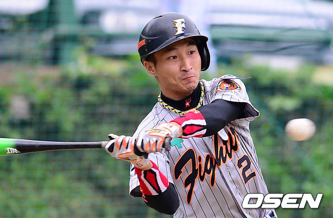 2회초 2사 주자 2,3루, 풍산 화이터스 서주민이 동점을 만드는 2타점 1루타를 치고 있다.
