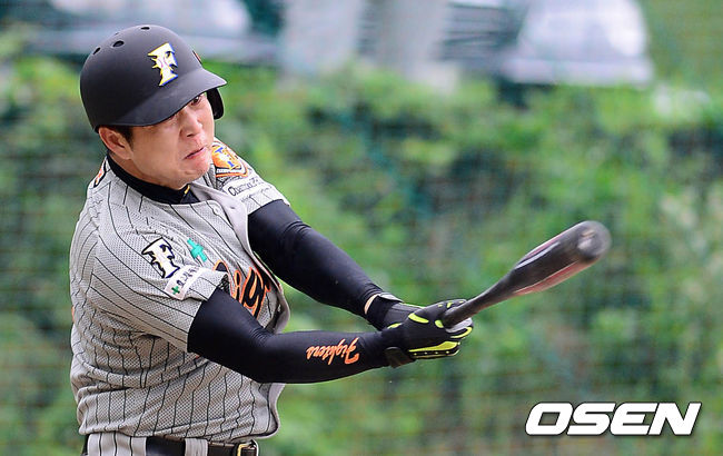 5회초 1사 주자 1,2루, 풍산 화이터스 정상묵이 2루 주자를 불러들이는 추격의 1타점 적시타를 치고 있다.