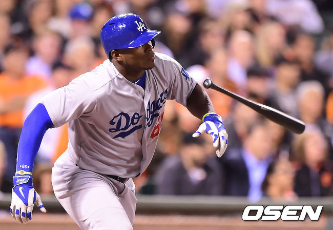[OSEN=LA(미국 캘리포니아주), 박승현 특파원]왼쪽 손 부상에서 회복, 5경기만에 선발 출장한 LA 다저스 외야수 야시엘 푸이그가 팀 한 경기 최다 3루타 타이 기록을 세웠다.
