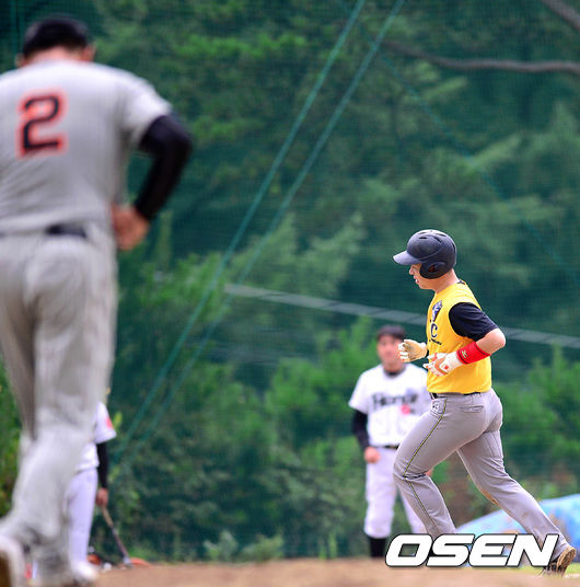 5회말 1사 주자 1루, 챔피언스 임정훈이 2점 홈런을 치고 베이스를 돌고 있다.
