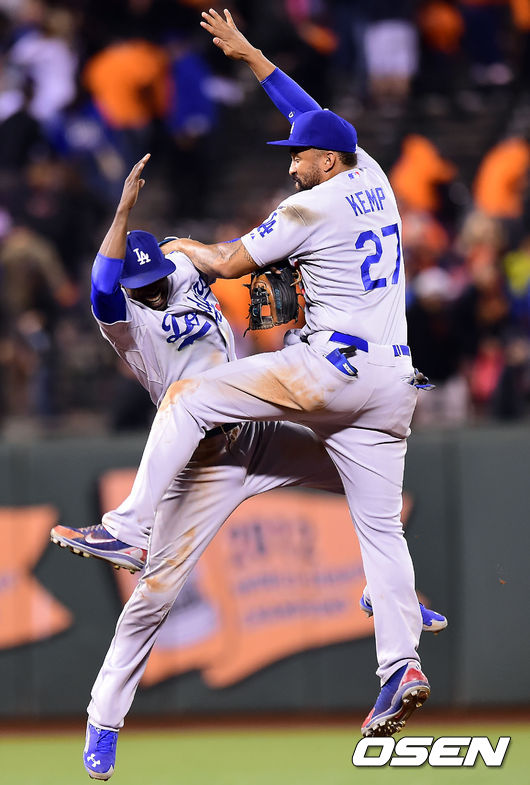 승리 거둔 다저스 고든과 켐프가 기뻐하고 있다./youngrae@osen.co.kr