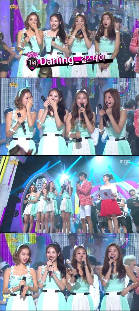 걸스데이는 신곡 '달링'으로 이날 박명수의 '명수네 떡볶이', B1A4의 '솔로데이'를 꺾고 1위를 차지한 후 "대박"이라고 외쳤다.