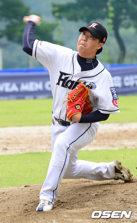 1회초 한빛소프트 선발 투수 조상출이 힘차게 공을 던지고 있다.